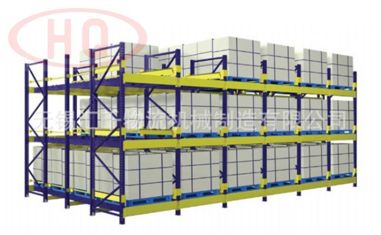 货架是在前后梁间以多层台车重叠相接,从外侧将叠栈货物置于台车推入,后储存之货品会将原先货品推往里面。