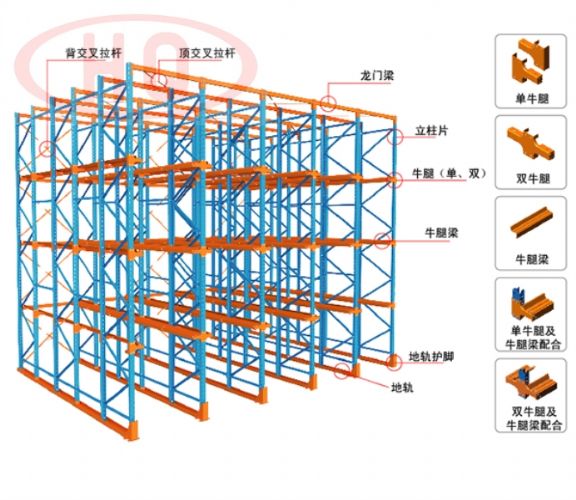 驶入式货架结构原理是把数排立柱片连接起来,没有横梁结构,用顶梁支撑,采用牛腿与托盘导轨连接而成,托盘货物架在托盘导轨上。叉车可直接驶入货道内进行存取货物,存放时先内后外,取货时先外后内,典型的先进后出存储理念,仓库空间利用率约为70%。