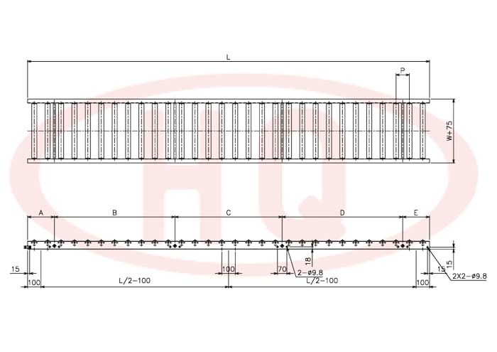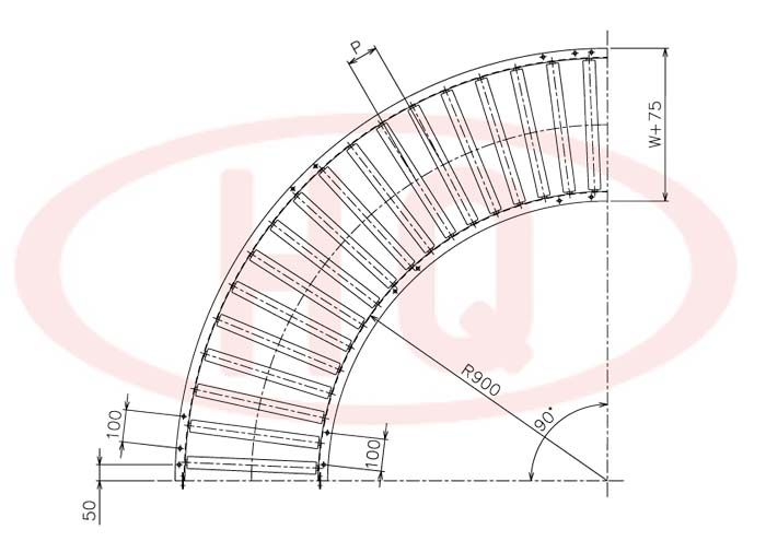| 型 号 | 滚筒外径(φ)×壁厚(t) 轴承 | 轴外径(φ)×壁厚(t) 加工 | 支架形状I×K×t 输送机高(H) | 机 长 L | 滚筒幅 宽 W | 滚筒间隔 P | 转弯半径 R | |||||