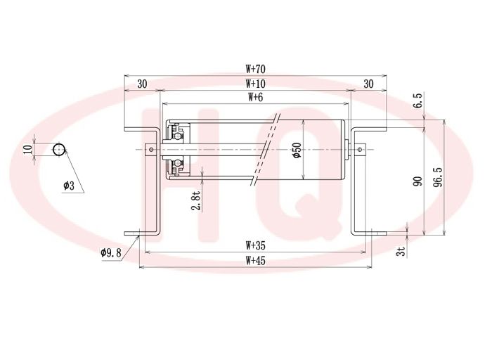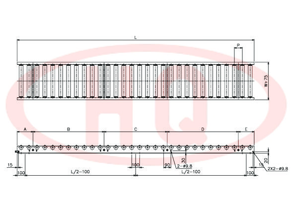 | 型 号 | 滚筒外径(φ)×壁厚(t) 轴承 | 轴外径(φ)×壁厚(t) 加工 | 支架形状I×K×t | 机 长 L | 滚筒幅宽 W | 滚筒间距 P | 转弯半径 R | |||||