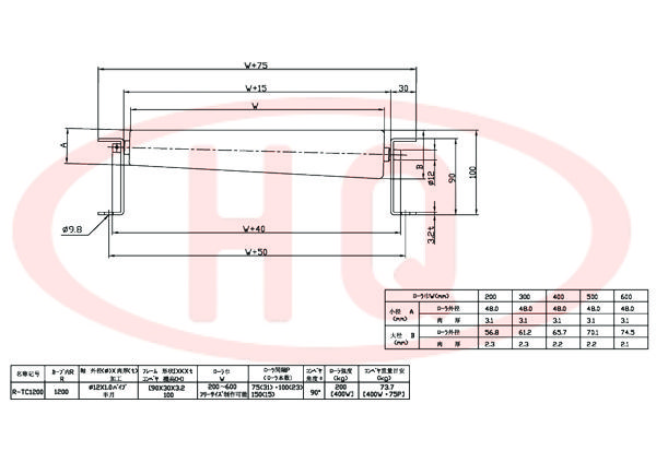 | 型 号 | 转弯半径 R | 轴外径(φ)×壁厚(t) 加工 | 支架形状I×K×t 输送机高(H) | 滚 筒 幅 宽 W | 滚筒间距 P (滚筒数) | 滚筒 角度 θ | 滚筒強度 (kg) | 输送机重量 (kg) | |||||