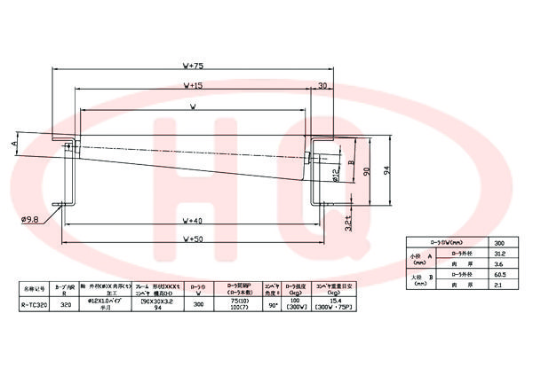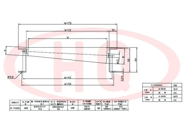 | 型 号 | 转弯半径 R | 轴外径(φ)×壁厚(t) 加工 | 支架形状I×K×t 输送机高(H) | 滚筒幅宽 W | 滚筒间距 P (滚筒数) | 输送机 角度 θ | 滚筒強度 (kg) | 输送机重量 (kg) | ||||