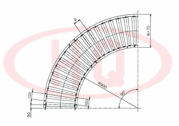 该型输送机为90度弧形转弯输送机,使用锥型滚筒,适用于输送机的转弯连接。